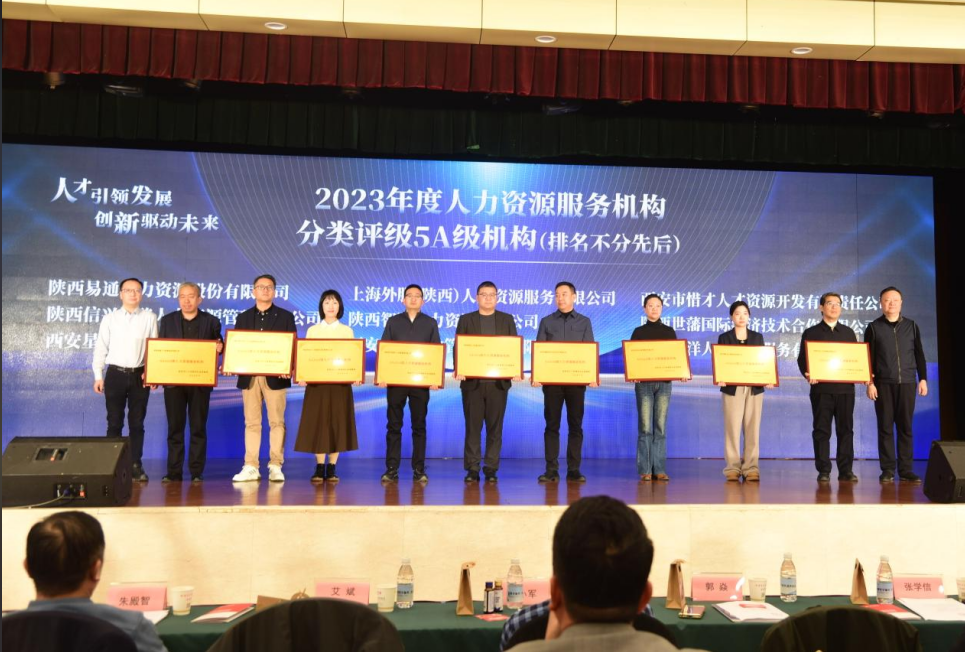 2024年12月17日,公司参加了由西安市人力资源服务行业协会举办的2024西安人力资源行业年度盛典,活动在美丽的西安止园饭店举行,我司被西安市人力资源和社会保障局授予“AAAAA”级人力资源服务机构荣誉并授牌匾。
